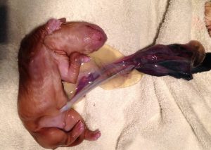 When each puppy is born, the mother will break open the amniotic sac, bite off her pup’s umbilical cord, clean the puppy profusely with her tongue to ensure proper breathing and circulation, and may even eat the afterbirth. It’s incredibly important that your dog does this as it’s the way in which a mother dog forms a bond with each puppy. If for some reason your dog refuses to do this after about 10-15 minutes. You should gently break open the amniotic sac, tie the umbilical cord about one inch from the belly in a knot or with dental floss, and cut the cord. You should then rub each puppy vigorously with a warm towel to stimulate breathing and circulation.